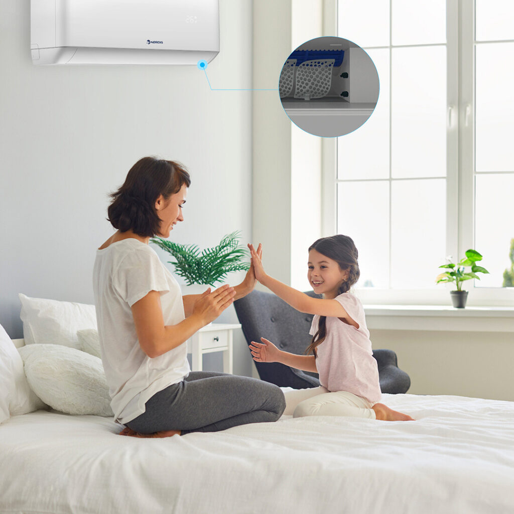 O jakość powietrza w pomieszczeniu dba oczyszczacz z zimną plazmą, który eliminuje bakterie, drobnoustroje oraz szkodliwe cząstki. Dodatkowo filtry o wysokiej gęstości skutecznie wychwytują kurz i pyłki, oczyszczając powietrze z drobnych zanieczyszczeń. Specjalnie zaprojektowany układ kanałów powietrznych zapewnia daleki zasięg i równomierne rozprowadzanie nawiewu, utrzymując stałą temperaturę w całym pomieszczeniu.