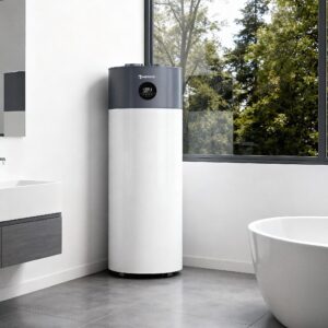 Pompa ciepła do ciepłej wody użytkowej zapewnia ciepłą wodę do codziennego użytku. Ten wydajny system może podgrzać wodę do 65°C lub nawet 75°C przy użyciu wbudowanej grzałki elektrycznej. Jest wyposażony w solidny zbiornik ze stali nierdzewnej, zaawansowaną izolację termiczną i wygodne inteligentne elementy sterujące dostępne za pośrednictwem Wi-Fi i ekranu dotykowego LCD. Zaprojektowany z wykorzystaniem energooszczędnej technologii, cichej pracy i wbudowanych funkcji bezpieczeństwa, takich jak ochrona przed legionellą i zamarzaniem, zapewnia stały komfort i długoterminową niezawodność.